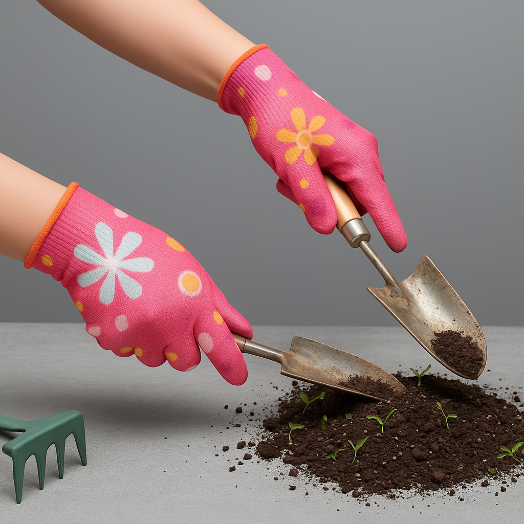 • Polyesteri suojakäsineet puutarhaan: Valmistettu kevyestä ja kestävästä polyesteristä, joka on synteettinen kuitu, joka tarjoaa joustavuutta, kulutuskestävyyttä ja helppoa hoitoa – ihanteelliset puutarhatöihin, suojaten liasta ja piikeiltä.